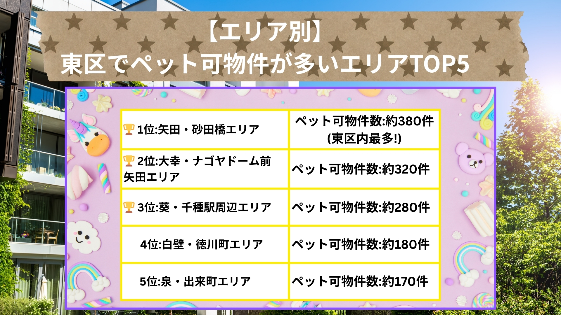 - ナゴヤドーム周辺は分譲マンションが多く、ペット可が標準
