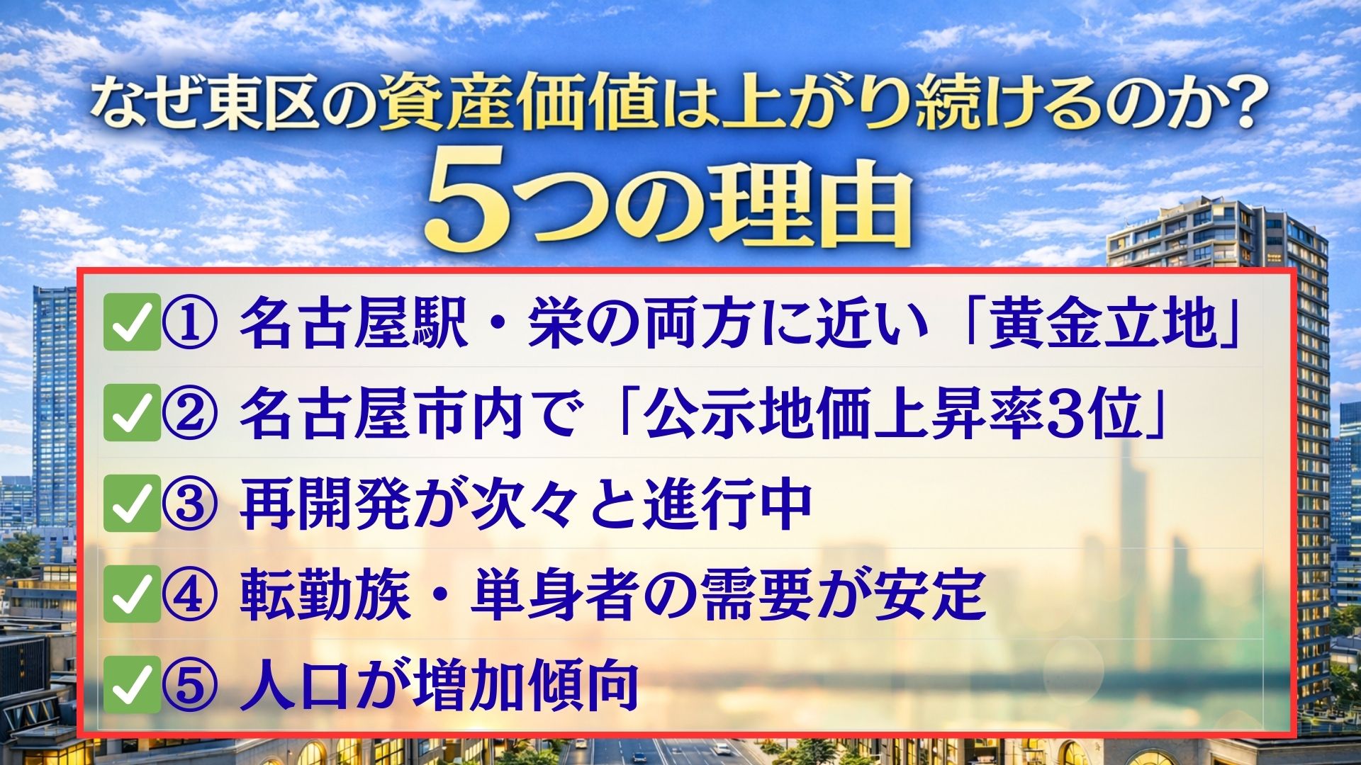 名古屋市東区の不動産は、2026年〜2030年にかけて資産価値が大きく上昇すると予測しています。